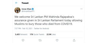 கொரோனா தொற்றினால் உயிரிழக்கும் முஸ்லீம் மக்களின் ஜனாஸாக்களை புதைப்பதற்கு அனுமதி வழங்கும் ஸ்ரீலங்கா பிரதமர் மஹிந்த ராஜபக்ஸ வின் அறிவிப்பை பாகிஸ்தான் பிரதமர் இம்ரான் கான் வரவேற்றுள்ளார்.